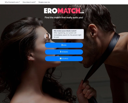 Wanneer je op zoek bent naar een sexpartner, dan wil je natuurlijk het liefste gebruikmaken van een website zonder verlegenheid of vooroordelen. Bij de website van Eromatch kun jij op een gastvrije manier in contact komen met de andere leden van de website. De naam van de website geeft eigenlijk al direct het doel van de website aan: erotische matches vinden. Bij Eromatch kan iedereen op zoek gaan naar een erotische match. Eromatch is namelijk een platform waar hetero's, homo's, lesbiennes en andere leden van de LGBTQ+ gemeenschap op zoek kunnen naar een erotische match.